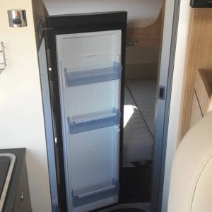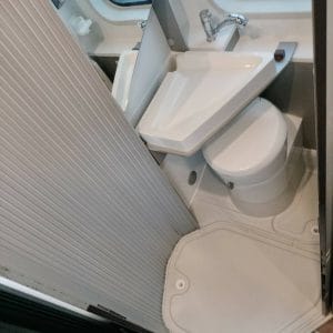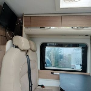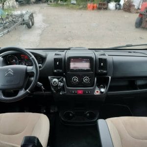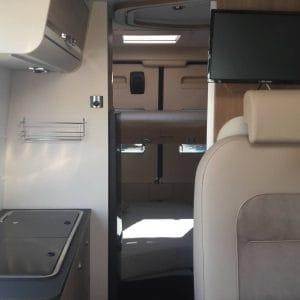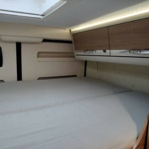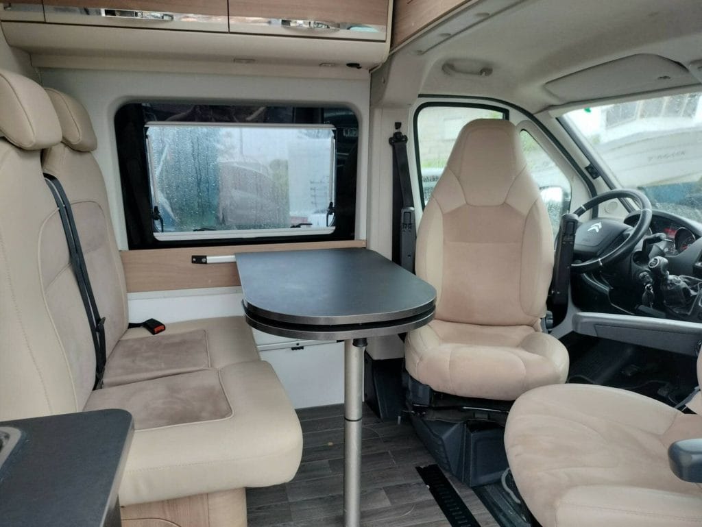 Su interior incluye calefacción y agua caliente, cocina de 2 fuegos, nevera grande de 145 litros con congelador, dos camas dobles (una desmontable si viajan dos personas), baño con ducha y extracción de gases, televisión con antena y USB, además de toldo con mesa, convertidor de corriente de 220V y 1000W. Se entrega con gas, menaje de cocina y productos químicos para el WC.