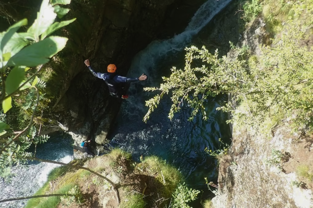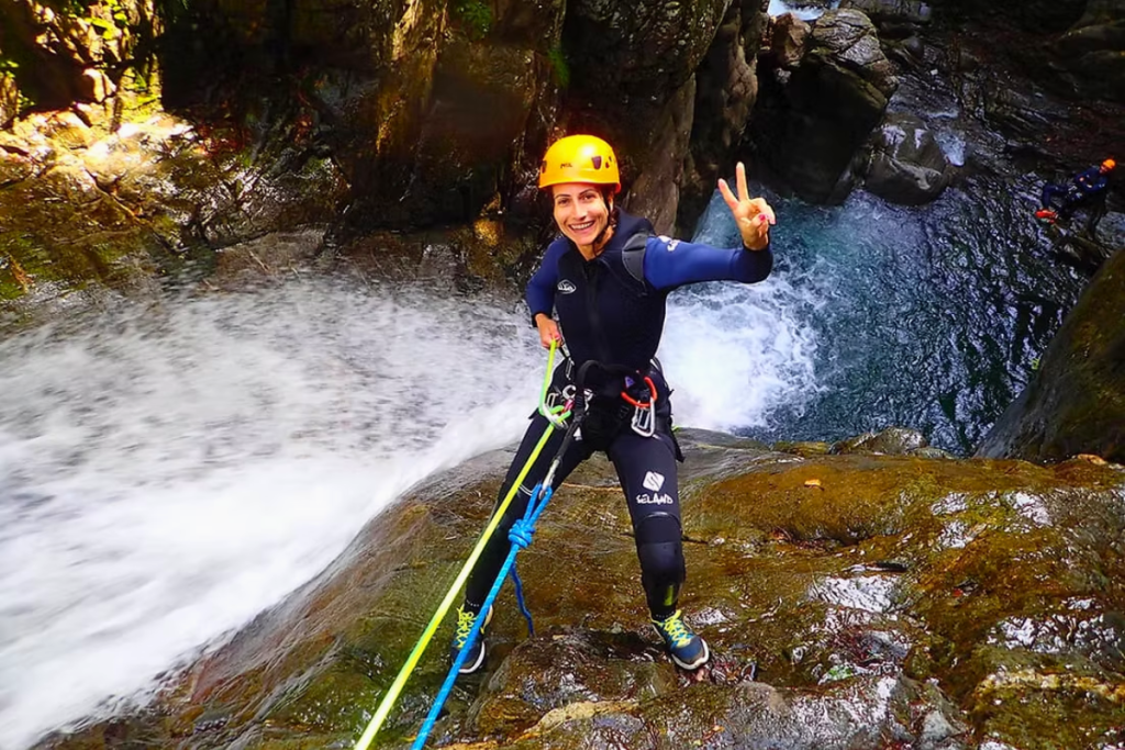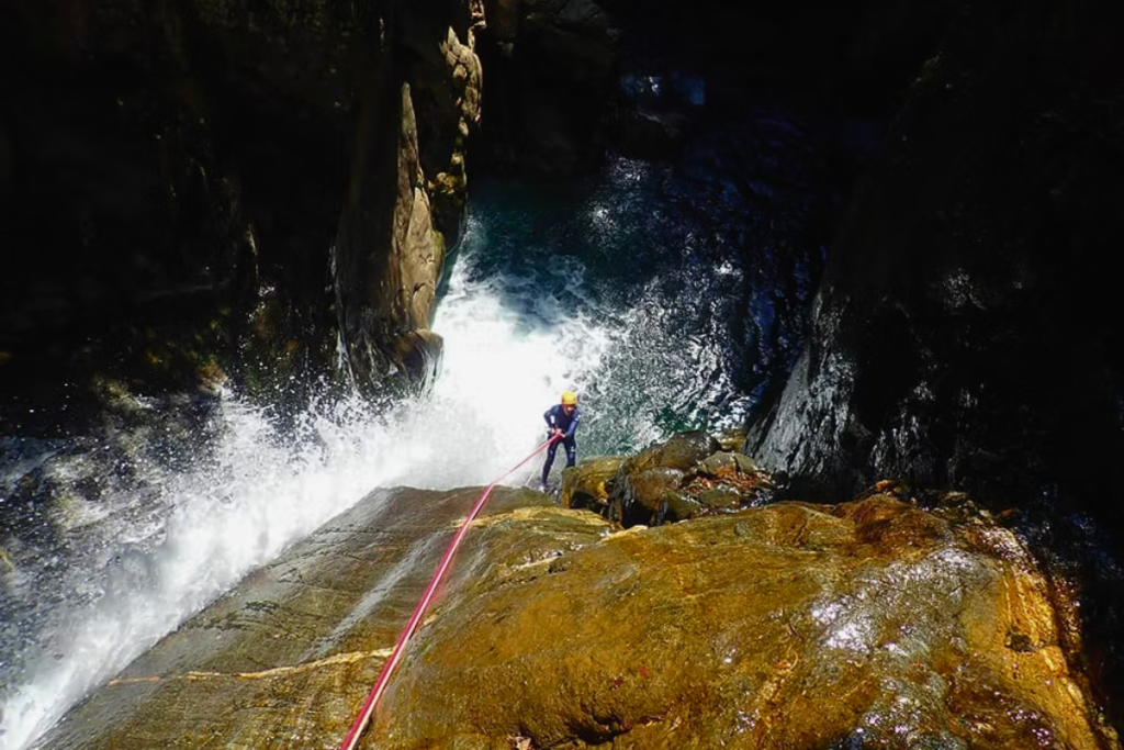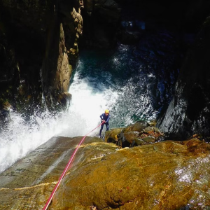 Podrás disfrutar de tres rápeles de 20 metros muy estéticos, algunos saltos (no son obligatorios), pequeños toboganes y un tobogán de 8 metros muy divertido.