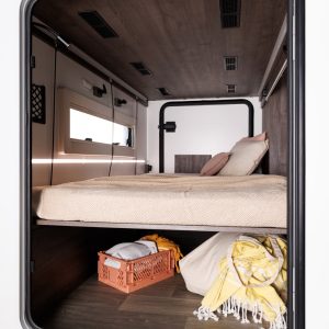 En la zona delantera, el salón es amplio y acogedor, ideal para disfrutar de momentos de calidad, sobre un espacio en el que se sitúa una cama basculante eléctrica que, junto a las literas, permite pernoctar con total comodidad sin renunciar a la agilidad de conducción que ofrece su chasis Ford.