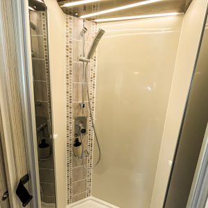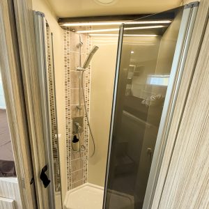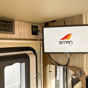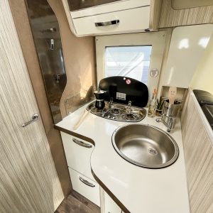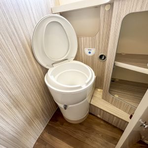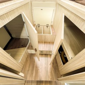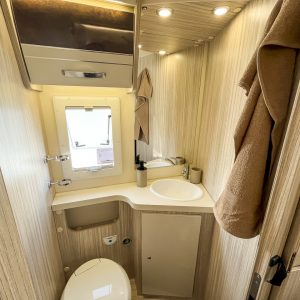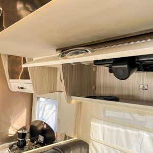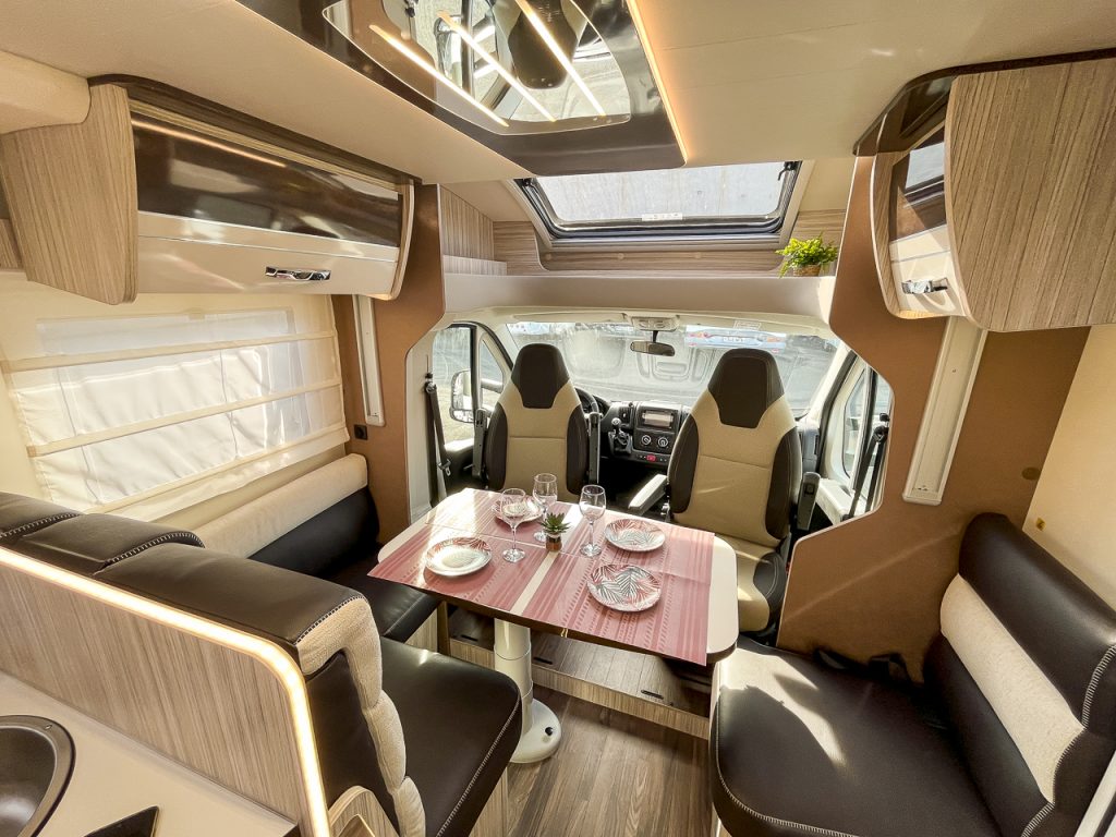 Sobre el salón se integra una cama basculante delantera que desciende suavemente, permitiendo que cuatro personas pernocten con total fluidez. Bajo el dormitorio principal se oculta un garaje de volumen excepcional, ideal para cargar bicicletas o equipo de aventura. Es la perfilada definitiva para familias que priorizan el orden y el confort.