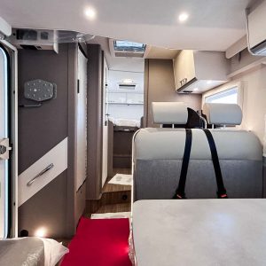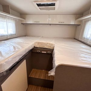 La Etrusco T 7.3 SF destaca por su diseño perfilado y elegante, ofreciendo un equilibrio perfecto entre amplitud y aerodinámica. Su distribución interior está protagonizada por dos camas gemelas traseras de gran formato, que garantizan un descanso independiente o pueden unirse para crear una superficie de pernocta mayor. Además, incorpora una cama basculante sobre el salón, permitiendo alojar a más ocupantes sin comprometer la habitabilidad diurna.