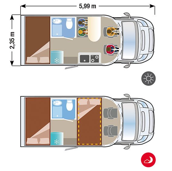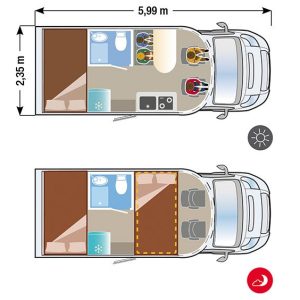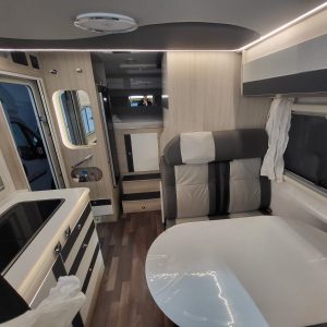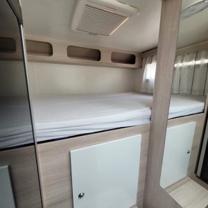 El secreto de su habitabilidad reside en una cama de techo delantera que se despliega sobre el salón, optimizando cada centímetro cuadrado durante el día. Además, cuenta con un garaje grande de dimensiones sorprendentes para su categoría, lo que garantiza un almacenamiento generoso para equipamiento deportivo o maletas voluminosas. Es la opción predilecta para quienes buscan un equilibrio perfecto entre dimensiones exteriores reducidas y un interior funcional y moderno.
