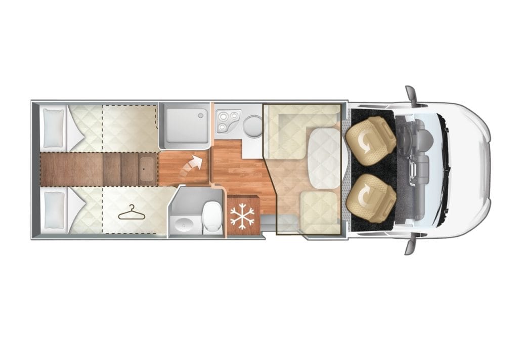 Dispone de camas gemelas en la parte trasera, una cama abatible sobre el salón y un espacio convertible adicional, ofreciendo distintas opciones de descanso según las necesidades del viaje. La cocina está completamente equipada, mientras que el baño con ducha y los amplios compartimentos de almacenamiento aseguran confort y practicidad durante toda la ruta.