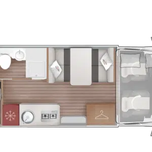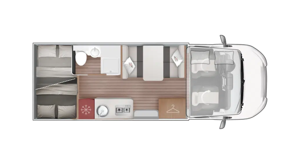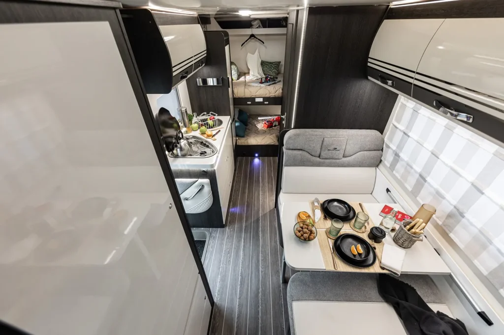 En su zona de día, la Kronos ofrece un salón funcional con mesa extensible que, junto a la gran cama doble situada sobre la cabina, permite pernoctar hasta a seis personas con holgura. La cocina está equipada con tres fuegos y una generosa nevera de 140 litros, ideal para largas estancias en la naturaleza. Con un baño compacto que integra una ducha con mampara y una longitud total de 6,99 metros, este modelo equilibra a la perfección la capacidad de almacenamiento extrema con una habitabilidad pensada para disfrutar de la libertad del viaje en grupo.