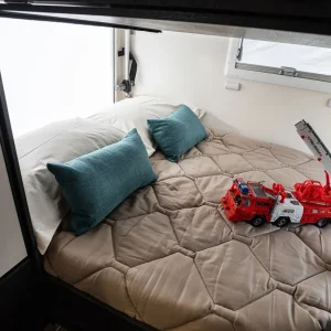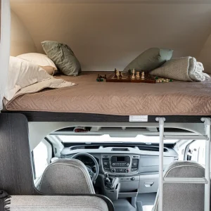 La Roller Team Kronos se presenta como una autocaravana capuchina excepcional, en la que su característica más distintiva es la configuración de sus espaciosas literas traseras, auténticas camas dobles, lo que permite alojar a cuatro personas en la zona posterior, sin tener que montar cama para los viajeros en la zona del comedor. Además, la cama inferior es regulable en altura (sistema Flex Space), lo que permite transformar el garaje en un espacio de dimensiones colosales.