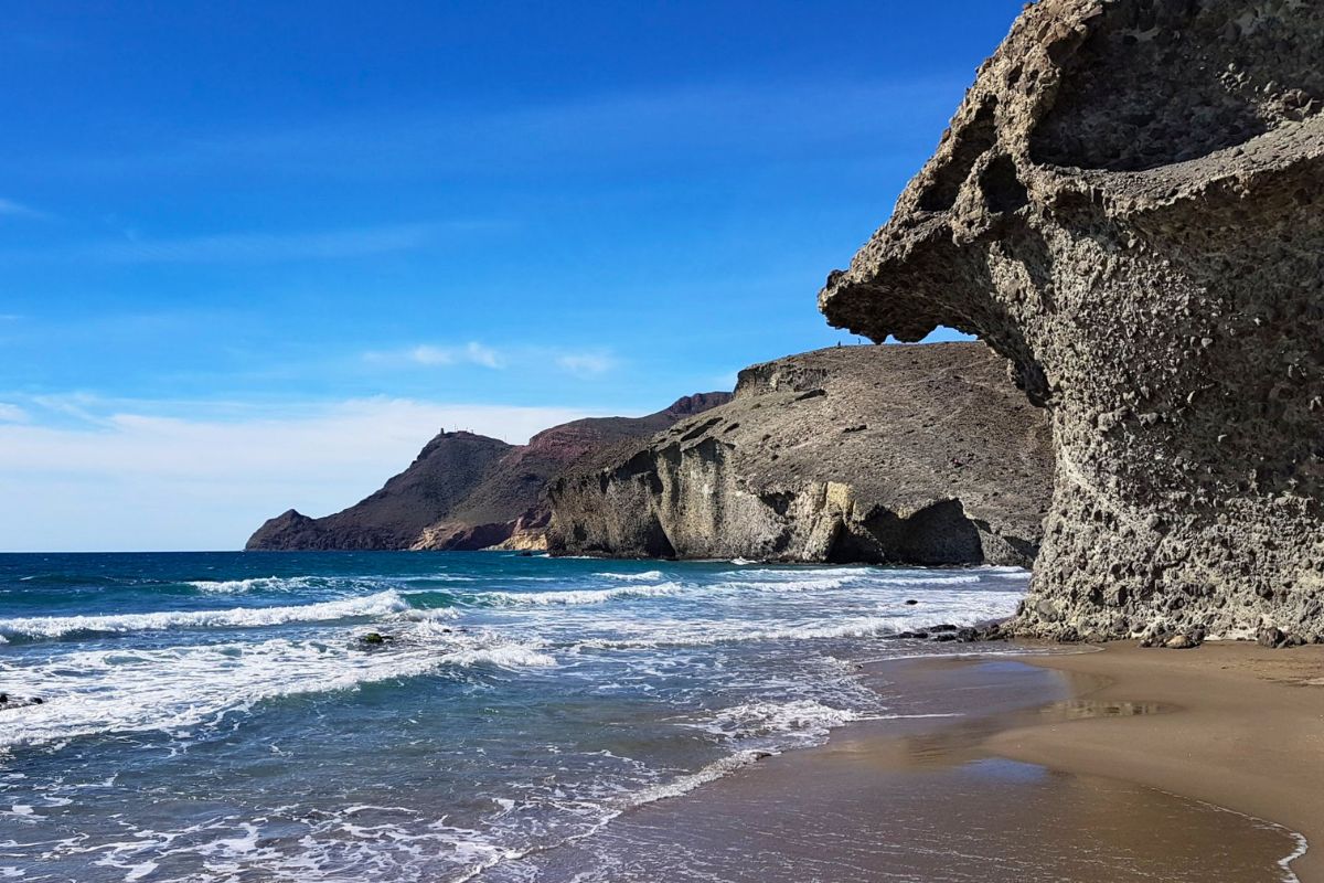 Nos adentramos en el tramo de costa más icónico y salvaje del Parque Natural de Cabo de Gata-Níjar. El trayecto es corto, de unos 30 a 40 minutos (20-25 km), conduciendo por el interior para llegar a las famosas calas de la zona de San José. La Playa del Mónsul es, sin duda, una de las playas más famosas y fotografiadas del Mediterráneo. Su importancia para nuestra ruta "Sol de Invierno" reside en su belleza virgen y la profunda desconexión visual y sonora que ofrece.